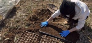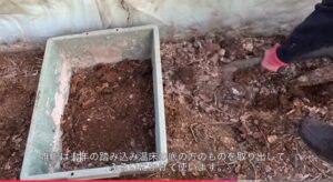 堆肥は去年の踏み込み温床の底の方のものを取り出して、ふるいにかけて使います。糸状菌がたくさんついているので大切に使います。ここに畑の土を堆肥と同じ量を入れて混ぜ合わせ、種を蒔いた上にかぶせます。