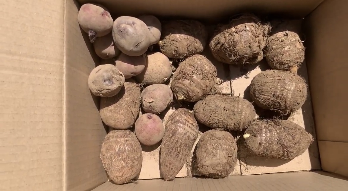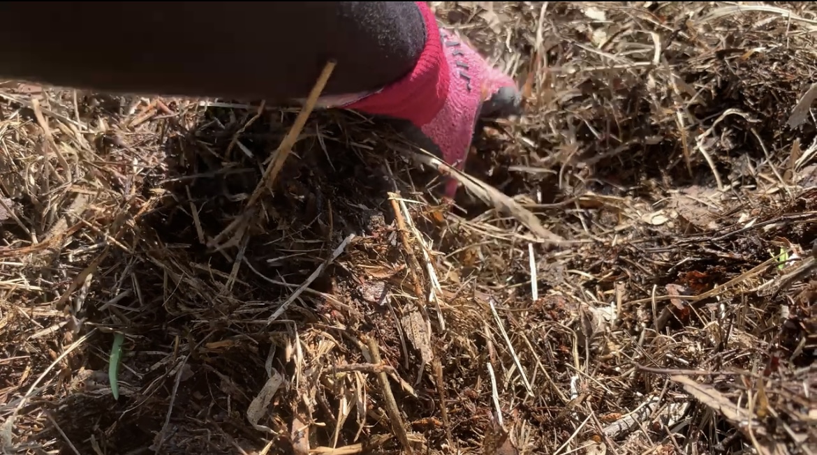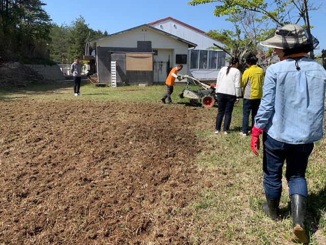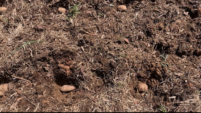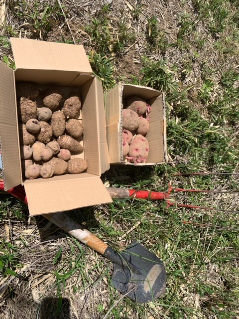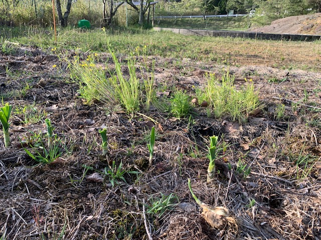 まずは畑を拡大するために耕していきます。耕しながら、石を取り除いていきます。…が、あまりにも多すぎて、取り除ききれません。 水菜は種取のために、そのままにしておきます。ニンニクは葉っぱが勢いついてきました。 畑拡大組と、植える組に分かれて作業していきます。今回植えるジャガイモと、里芋です。 里芋を植えていきます。15㎝ほど掘って植えたいのですが、土が固いので、少し掘って、横向きに置き、その上に木の葉を15㎝ほど被せました。 ジャガイモも同じ要領で植えていきました。 ジャガイモを植える場所は、さらに硬いためスコップで掘りました。 なかなか掘れない場所は、三角ホーも使いました。 ジャガイモも15㎝ほど土を乗せていきます。 畑拡大チームは、山から木の葉や腐葉土を運び、耕した場所に敷いていきます。地味に疲れる作業ですが、とても重要な作業です。