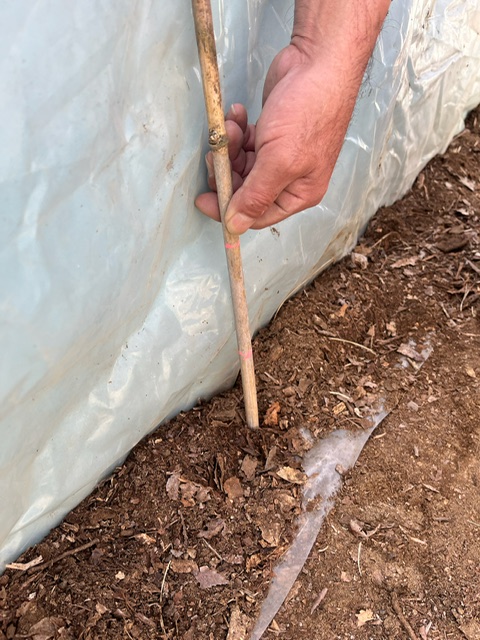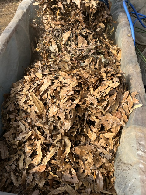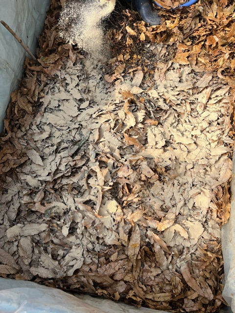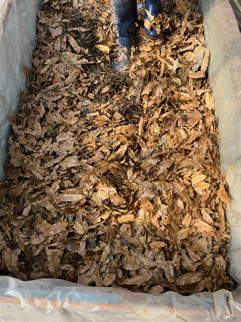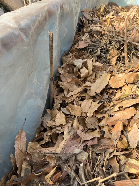 まずは落ち葉を20㎝ほど敷き詰めていきます。目安の棒を入れておきます。