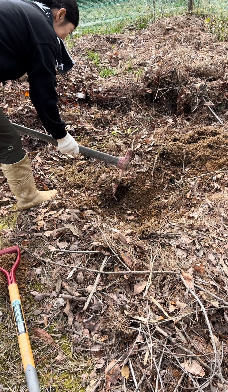 だけど、土がまだ硬いので、植えるために土を掘り起こすのも大変です。3本植えるのに半日かかりました。つるはしで掘らないと、スコップではとても太刀打ちできません。