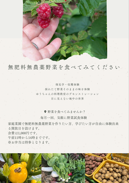 2024年7月に波動(意識)農法の現地講習会を開催します。 波動(意識)農法野菜を食べてみて下さい。21日(日曜日)と25日(木曜日)に行います。 無肥料無農薬の畑を見学、体験してもらい、家庭菜園から地球再生へ興味を持っていただけるようなイベントとなっています。波動意識農法で作った野菜や料理を食べて、畑の波動や声を直に感じてみてください。![]()