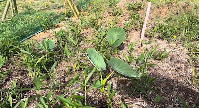 6月24日撮影:里芋の葉も小さいけれど「頑張って育ってるよ!」とワクワク元気な感じが伝わってきます。周りの笹が凄く気になりますが、とりあえず、このままでいきます。